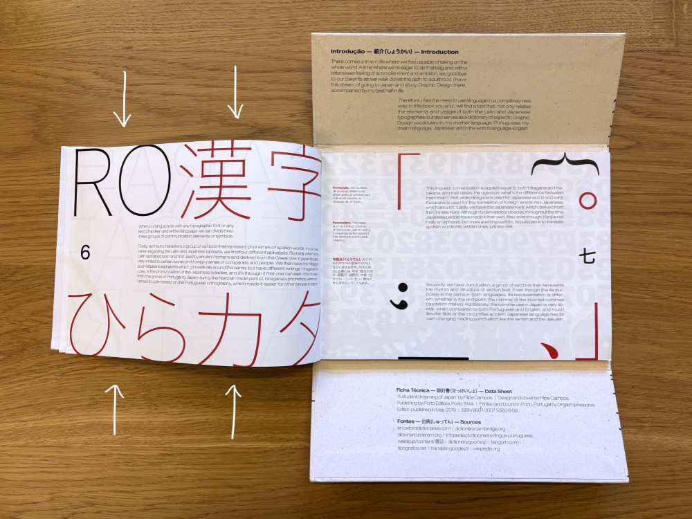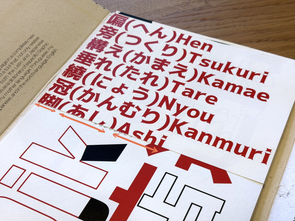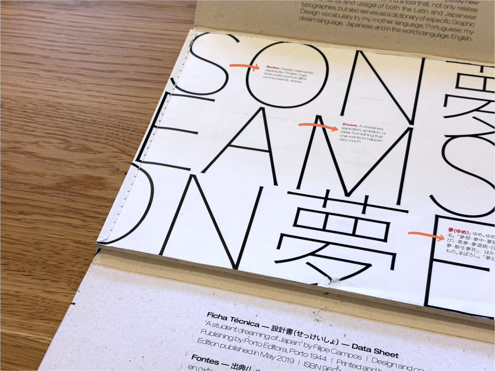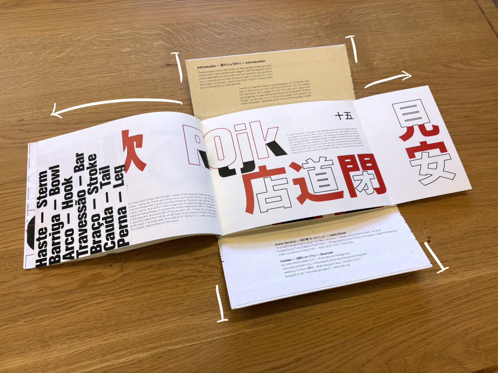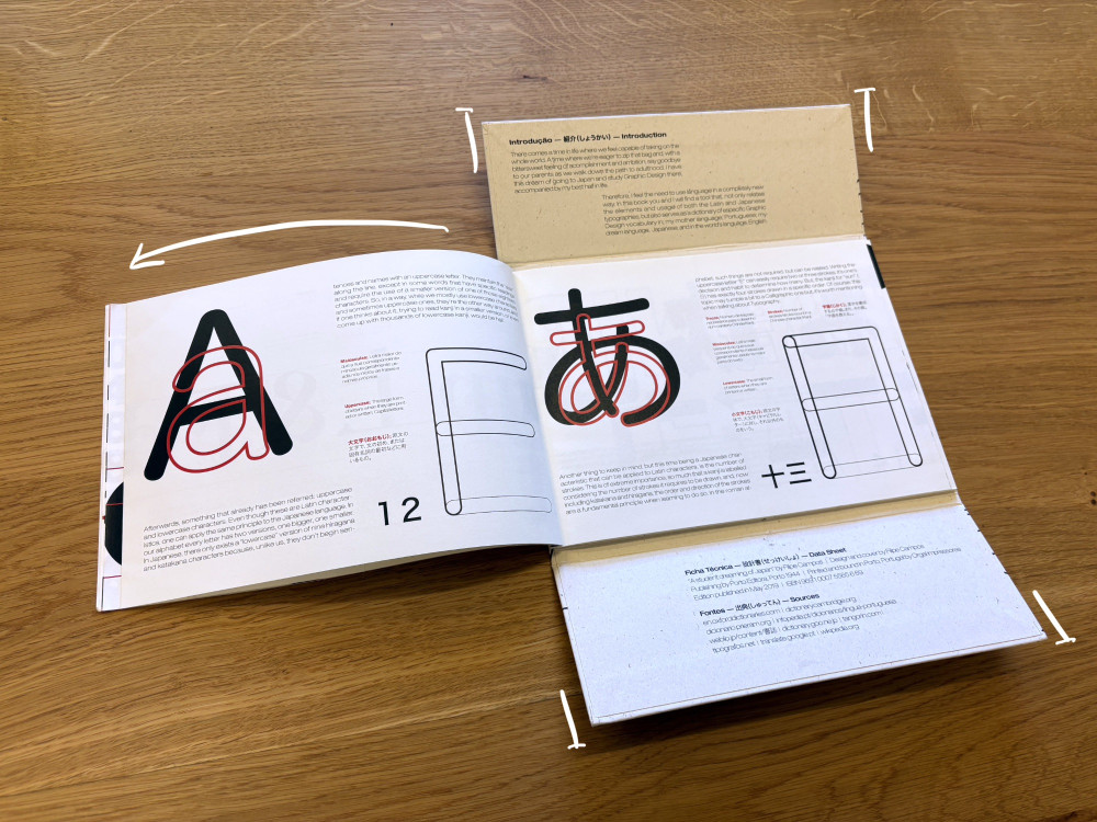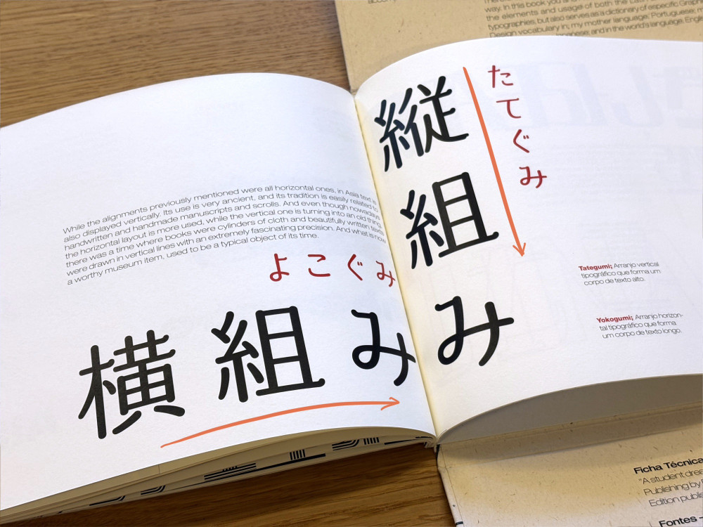 At the same time, the project tried (but failed) to also be a trilingual dictionary—Portuguese, English, and Japanese—on graphic design and typography related terms. This introduced a third component in the book's visual narrative that functioned as smaller secondary highlights and annotations.